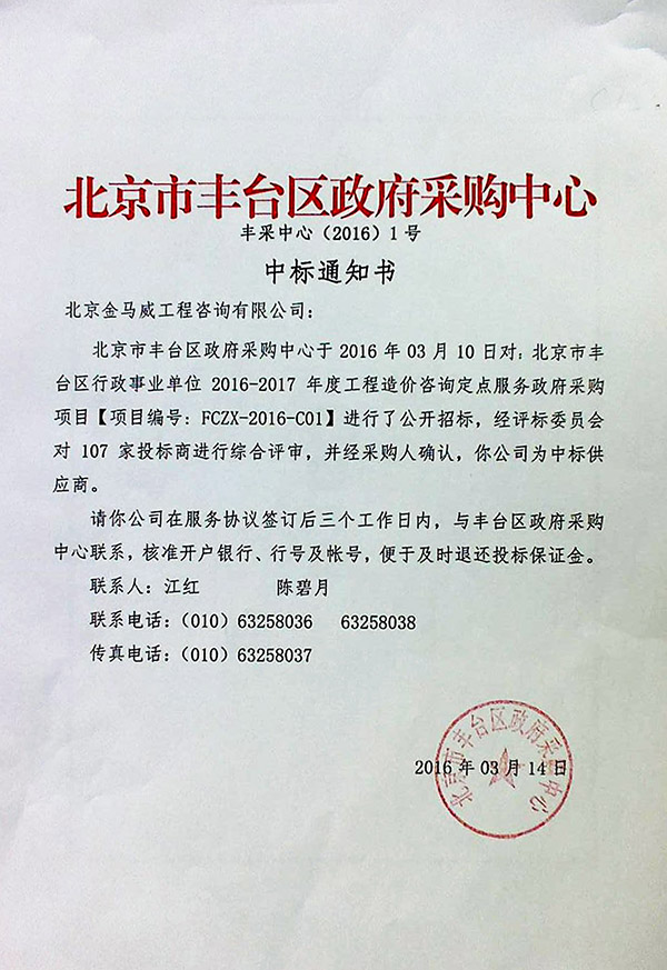 3月10日,北京市丰台区行政事业单位2016-2017年度工程造价咨询定点服务政府采购项目(项目编号:FCZX-2016-C01)进行了公开招 标,据悉,一共有107家工程造价咨询公司参与了投标,我公司经评标委员会的综合评审,并经采购人确认,为此项目中标供应商。