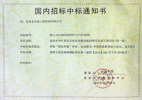 3月28日,北京金马威工程咨询有限公司经重庆市政府采购中心评审,中标重庆市PPP项目专业咨询服务机构推荐名单入围项目(第一批)。